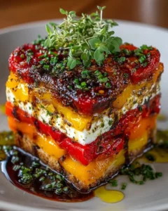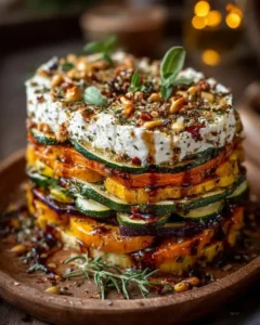 Savory Roasted Vegetable Stack with Goat Cheese and Honey Pecan Glaze