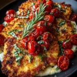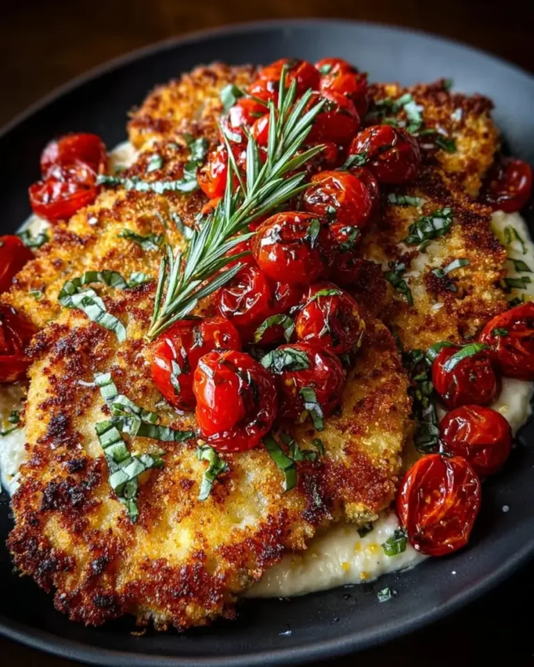 Chicken Milanese with Whipped Feta, Roasted Tomatoes & Lemon Basil Oil – A Vibrant Mediterranean-Inspired Dinner