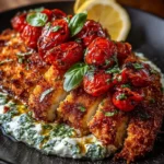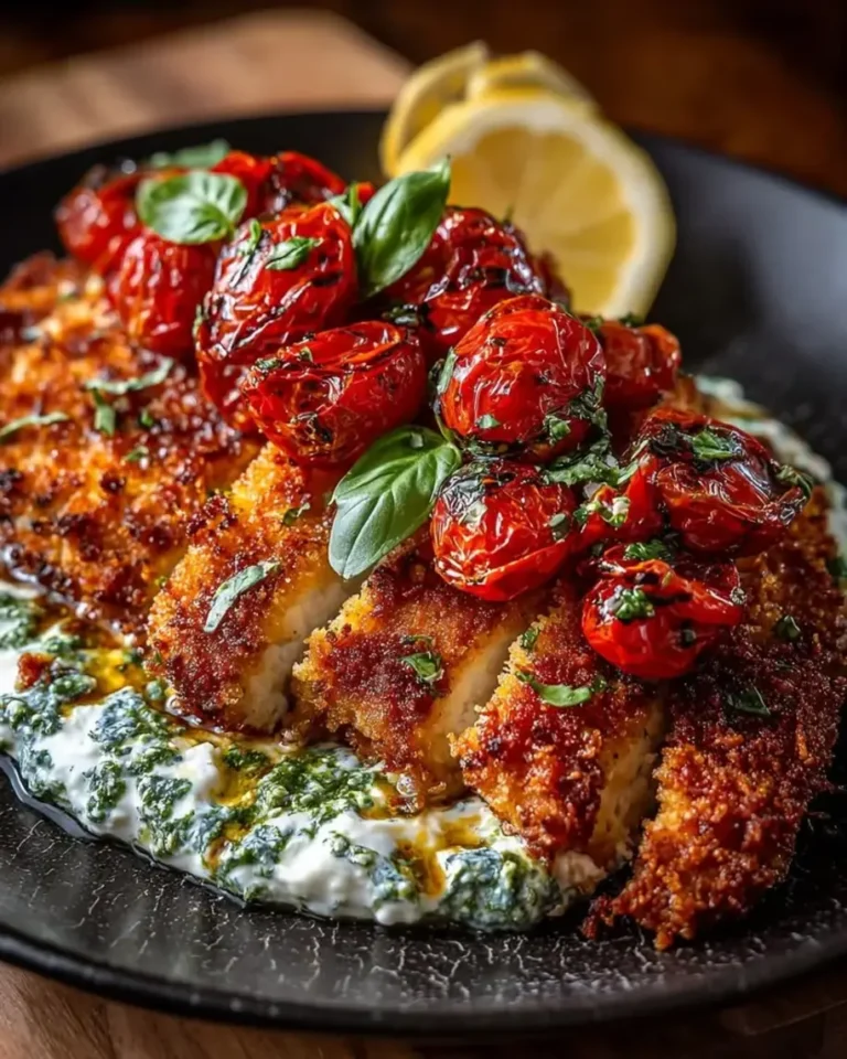 Crispy Chicken Cutlets with Whipped Feta, Roasted Tomatoes and Basil Oil: A Vibrant Mediterranean-Inspired Dinner
