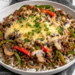 Juicy ground beef with caramelized peppers, onions, mushrooms, and melted cheese served over fluffy basmati rice. A bold, satisfying high-protein meal prep ready in 35 minutes.