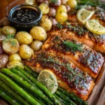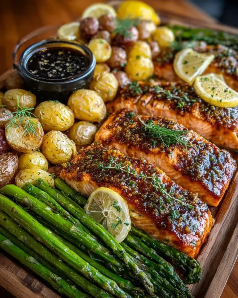 Honey Mustard Glazed Salmon with Roasted Asparagus Spears & Garlic Potatoes: A One-Pan Wonder for Busy Weeknights