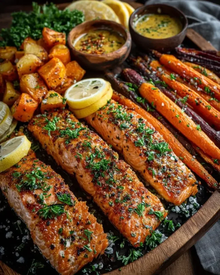 Honey Mustard Glazed Salmon with Roasted Carrots & Maple Glazed Sweet Potatoes – A Sweet and Savory Weeknight Delight