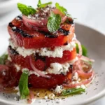 The Grilled Watermelon Tower with Whipped Ricotta & Pickled Onions is more than just a recipe; it’s an experience. It’s a testament to how simple ingredients, prepared with a little creativity, can yield extraordinary results. The smoky char of the grilled watermelon, the creamy, cool ricotta, and the bright, tangy pickled onions create a flavor profile that is both unexpected and incredibly satisfying. This dish is perfect for those hot summer days when you crave something light, refreshing, and bursting with flavor. It’s a conversation starter, a palate pleaser, and a beautiful addition to any meal. Don’t be afraid to experiment with the garnishes – a drizzle of balsamic glaze or a sprinkle of feta cheese could also be delightful additions! Give this recipe a try and discover a new favorite way to enjoy watermelon this season!