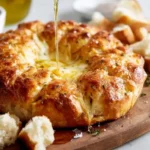 A fluffy focaccia bread with a gooey cheese center, perfect for sharing with friends and family.