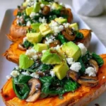 Once the sweet potatoes are fork-tender, carefully remove them from the oven. Let them cool just enough so you can handle them. Slice each sweet potato lengthwise, being careful not to cut all the way through, creating a ‘boat’. Gently fluff the insides with a fork, creating a well for the filling. Spoon the sautĂ©ed spinach, mushroom, and onion mixture generously into each sweet potato half. Top with the diced avocado and sprinkle the crumbled feta cheese over everything. Return the stuffed sweet potatoes to the oven for another 5-10 minutes, just long enough for the feta to begin to soften and meld with the other ingredients, and for everything to get wonderfully warm.