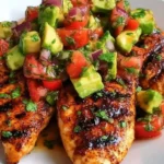 A zesty and flavorful chicken dish topped with a fresh avocado salsa, perfect for a refreshing meal.