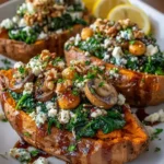 Mediterranean Loaded Sweet Potatoes with Garlic Spinach, Mushrooms & Feta – A Healthy, Flavorful Weeknight Delight