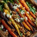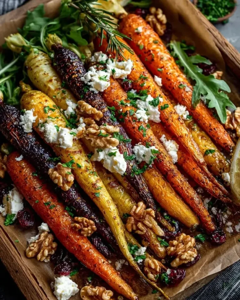 These roasted carrots with goat cheese, hot honey & crunchy walnuts aren’t just a side dish; they’re a centerpiece! For presentation, I love arranging the roasted carrots artfully on a long, narrow platter, letting their beautiful colors shine. The crumbled white goat cheese provides a stunning contrast against the vibrant orange and purple hues of the carrots, and the glossy hot honey drizzle catches the light beautifully. A final sprinkle of fresh parsley or finely chopped chives brings a touch of green and a fresh aroma, reminiscent of the herb gardens from my mother’s village in Morocco.