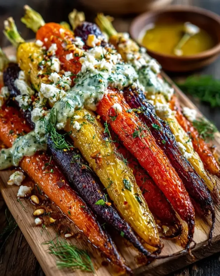 Presentation is everything, darling! In my French culinary training, plating was as important as the taste itself. For these beautiful roasted garlic butter carrots, arrange them artfully on a shallow platter, perhaps a rustic ceramic dish to highlight their earthy charm. Then, with a spoon, drizzle the vibrant lemon herb feta sauce generously over the top. The bright white of the sauce against the deep, warm colors of the heirloom carrots is visually stunning. A sprinkle of extra fresh dill or finely chopped parsley and maybe a grating of lemon zest for garnish adds a final flourish, hinting at the fresh flavors within.