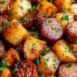 This White Sweet Potato and Honey Garlic Sausages recipe features roasted white sweet potatoes tossed with caramelized smoked sausage in a honey garlic glaze. Easy, hearty, and perfect for weeknight dinners.